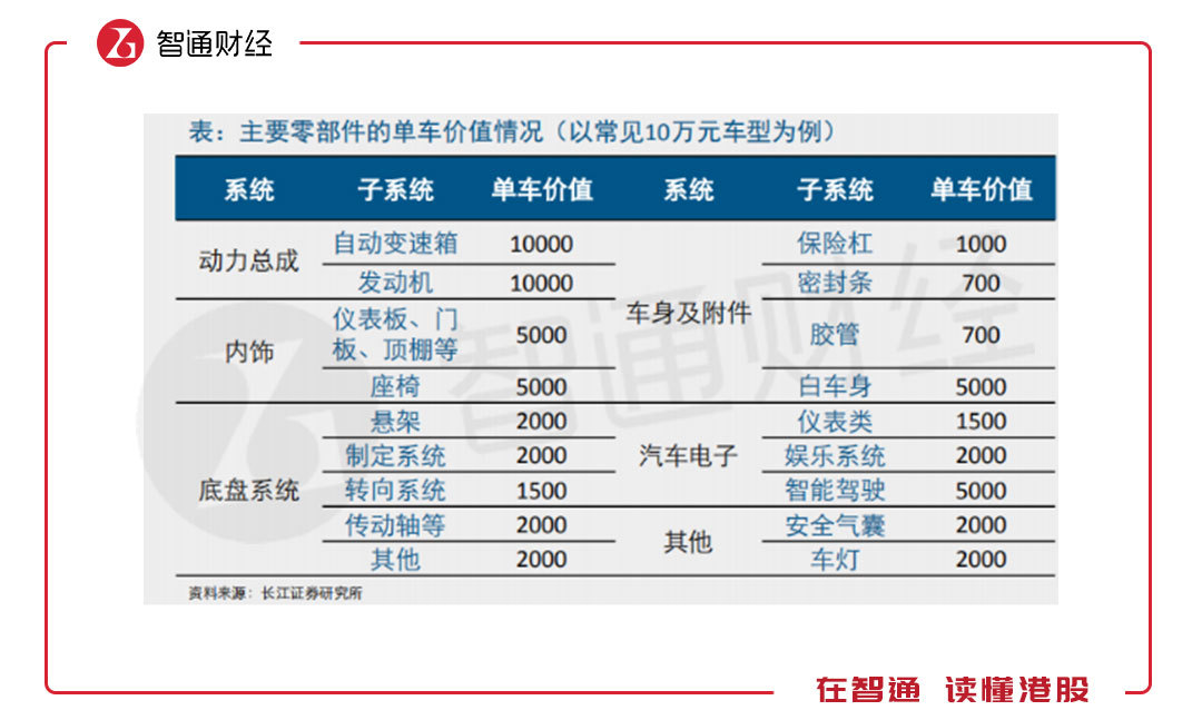 先看燃油車,按照長江證券的研究,以10萬元車型為例,各系統(tǒng)價(jià)值合計(jì)5.58萬元,動(dòng)力總成占了35.8%,內(nèi)飾及汽車電子占33%,底盤占17%,車身及附件占13.3%。