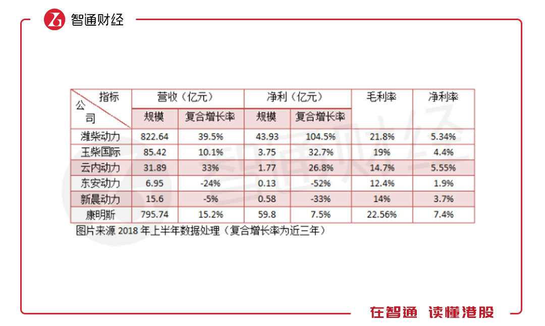 國內(nèi)的發(fā)動(dòng)機(jī)供應(yīng)市場高度集中,前十大供應(yīng)占據(jù)了超過7成的份額,主要為柴油機(jī)供應(yīng),適用于商用車,龍頭濰柴動(dòng)力(02338)市場份額最大。汽油機(jī)適用于乘用車,由于主要為內(nèi)供,市場數(shù)據(jù)較少。與國際龍頭康明斯相比,上半年國內(nèi)的柴油機(jī)企業(yè)賺錢能力還是較低的。