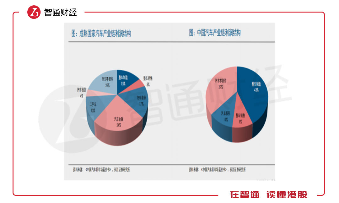在港股上市公司中,汽車經(jīng)銷商主要銷售的均為進(jìn)口豪華車型,比如奧迪、奔馳及寶馬車型,主要還是國內(nèi)的自主品牌制造商有自己專門的銷售渠道。整體來看,銷售環(huán)節(jié)利潤率一般都不高,凈利率賺個(gè)售價(jià)的3-5個(gè)百分點(diǎn)左右。汽車后市場龐大,但目前市場較為零散,還未形成較大規(guī)模的企業(yè)。