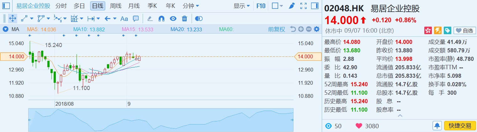 易居是國內(nèi)最大的房地產(chǎn)服務(wù)商,伴隨港股一波熱鬧非凡的上市潮,成立剛滿18年的易居于7月20日風風火火上市,之后也在新股“破發(fā)潮”中慘遭錯殺,一度下探至11.1港元,但價值總會回歸,隨著易居的商業(yè)模式和業(yè)績被市場認可,股價逐步回升。