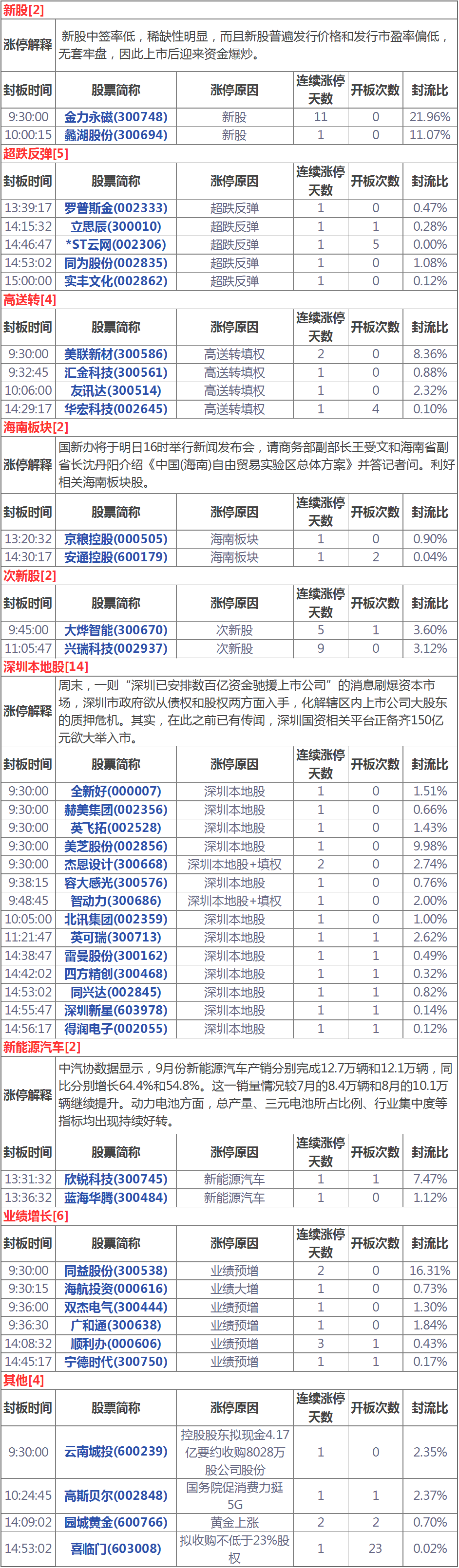 漲停分析:深圳本地股多股漲停高送轉板塊持續(xù)強勢(10月15日)