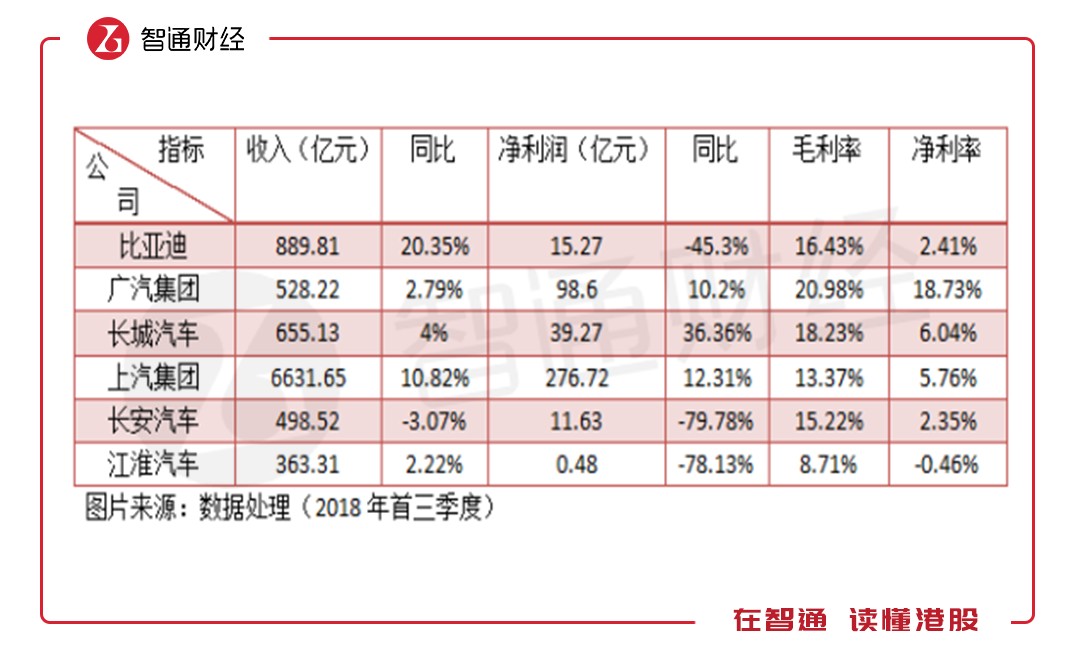 從抽樣的標(biāo)的看,2018年首三季度比亞迪(01211)的收入增速是最快的,其次是上汽集團,其余標(biāo)的增速單位數(shù)甚至是負(fù)增長,在此次標(biāo)的中,沒有自主品牌龍頭吉利汽車(00175),不過以該公司上半年的收入增速看,和比亞迪是同一個高增長賽道。在盈利上,各個車企差異還是挺大的,不過,在這塊操作靈活性較大。