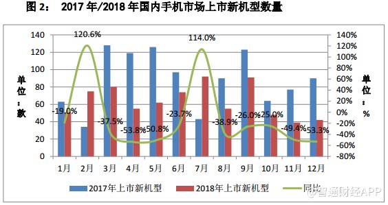 2018年全年,上市新機(jī)型764款,同比下降27.5%,上市新機(jī)型中含2G手機(jī)171款、3G手機(jī)3款,4G手機(jī)590款。