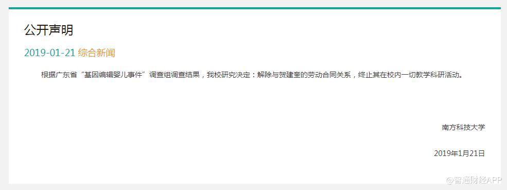智通財(cái)經(jīng)APP獲悉,1月21日,南方科技大學(xué)發(fā)出公告稱,根據(jù)廣東省“基因編輯嬰兒事件”調(diào)查組調(diào)查結(jié)果,我校研究決定:解除與賀建奎的勞動合同關(guān)系,終止其在校內(nèi)一切教學(xué)科研活動。(李程)