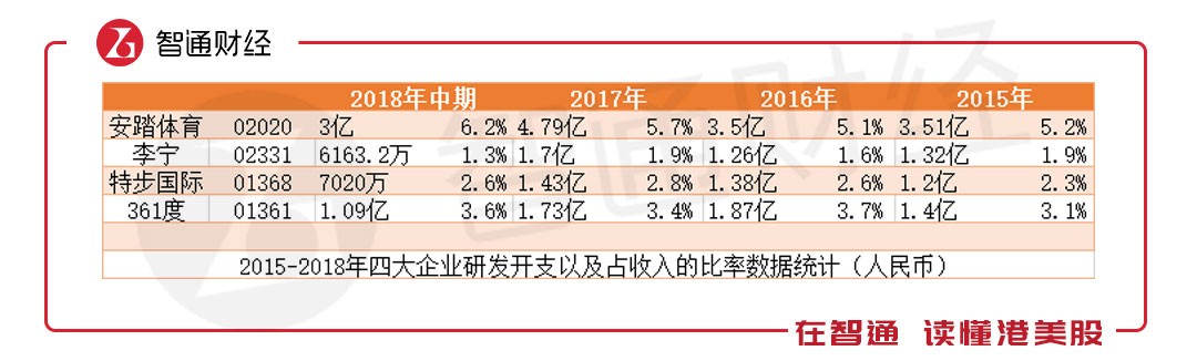 從2015-2018年中期,李寧的研發(fā)支出一直是國內(nèi)四大體育用品企業(yè)中最低的。以2018年上半年為例,李寧的研發(fā)支出為6163.2萬元,占當期收入的比率僅為1.3%,而安踏研發(fā)支出高至3億元,就連特步、361的研發(fā)支出比率都高于李寧。