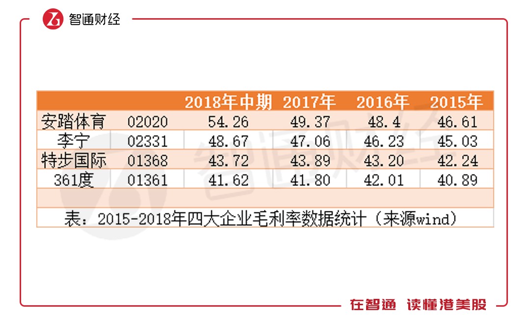 與存貨周轉(zhuǎn)率一起穩(wěn)步增長的,還有毛利率,從2015年的45.03%上升至2018年上半年的48.67%。但與安踏一比,差距就出來了。2015年時,雙方的毛利率差距僅1.58個百分點。但隨著安踏規(guī)模的擴大,規(guī)模響應逐漸體現(xiàn),李寧與安踏的毛利率差距加大,2018年上半年時,差距擴大至5.59個百分點,但李寧毛利率仍高于特步和361。