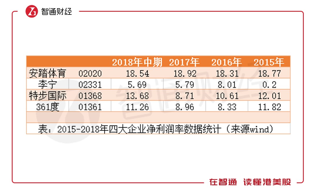 然而,高毛利優(yōu)勢并未在利潤中體現(xiàn)。2015年時,李寧的凈利潤率為0.2%,2016年時上升至8.01%,2018年上半年時,安踏、特步、361的凈利潤率分別為18.54%、13.68%、11.26%,均遠高于李寧的5.69%。