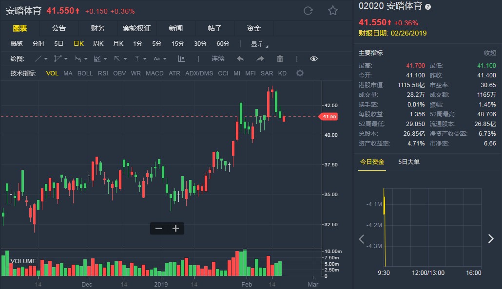 截至發(fā)稿,安踏體育(02020)升0.36%,報41.550港元。(劉大洋)