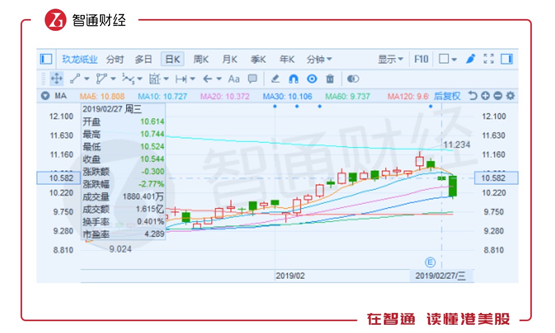 自周一港A股暴漲之后,玖龍紙業(yè)(02689)股價(jià)便已經(jīng)歷連續(xù)三天下跌。2月27日,公司召開業(yè)績(jī)會(huì)當(dāng)天,公司股價(jià)收?qǐng)?bào)10.54,跌2.77%;28日續(xù)跌4.68%至8.14港元。