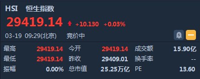 恒生指數(shù)開(kāi)盤(pán)漲0.03%,報(bào)29417.14點(diǎn)。國(guó)企指數(shù)漲0.06%,報(bào)11681.76點(diǎn)。紅籌指數(shù)跌0.12%,報(bào)4675.12點(diǎn)。大市盤(pán)前成交15.9億港元。隔夜美股三大股指集體收高。