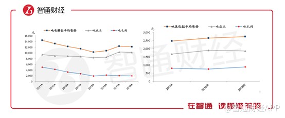 二是因為其產(chǎn)品噸成本居高不下,拿電解鋁來說,2015年之前,隨著售價的明顯下降,噸成本卻保持穩(wěn)定,導致利潤空間被壓縮。新生產(chǎn)品氧化鋁毛利率目前還比較穩(wěn)定,并且高于電解鋁的毛利率。這可能也是氧化鋁業(yè)務占比迅速擴大的原因。