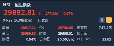港股收盤(4.29)|恒指升287點報29892點僅成交747億