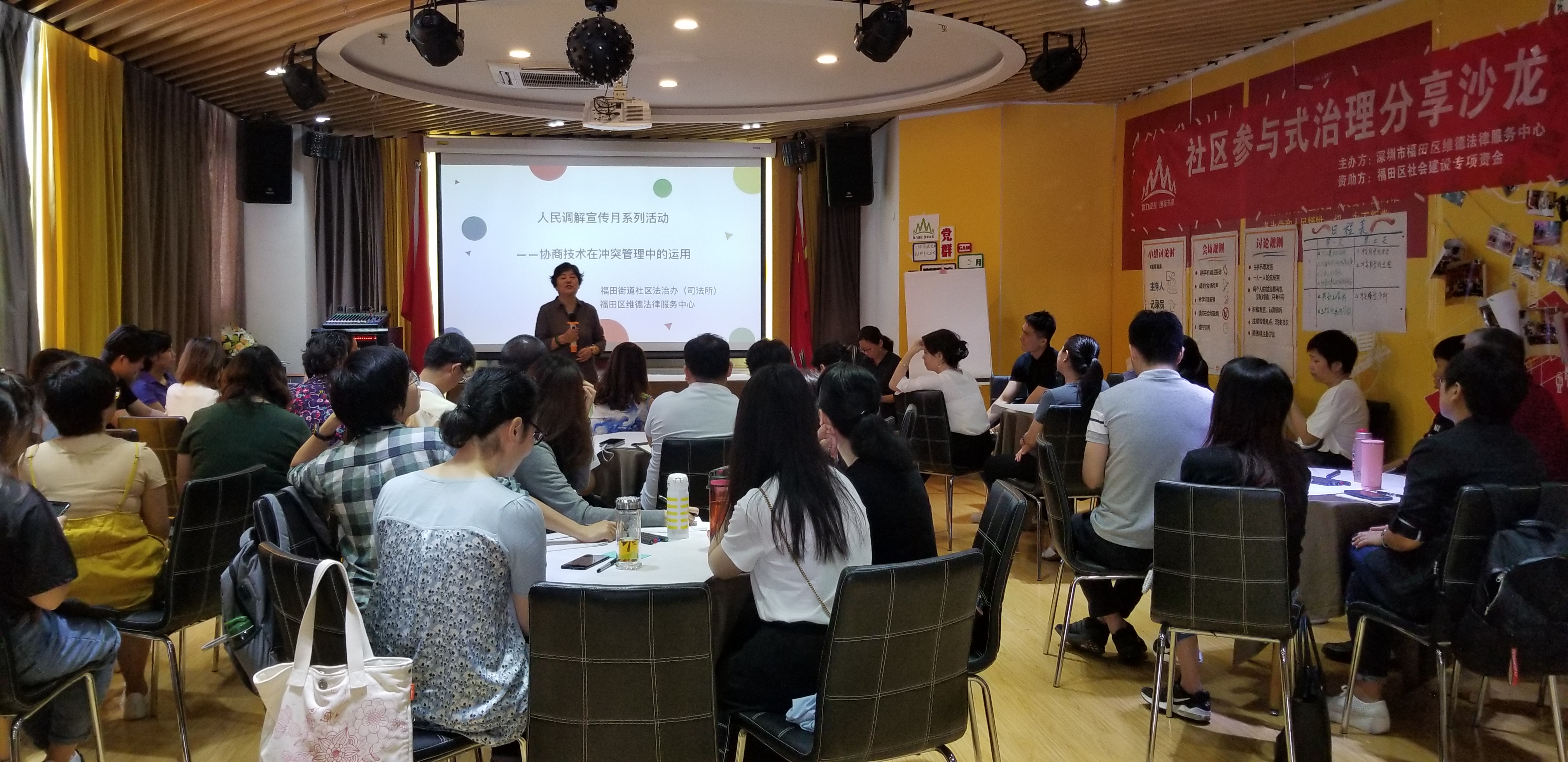 5月15-16日,由“福田區(qū)社會(huì)建設(shè)專(zhuān)項(xiàng)資金”資助的社區(qū)議事能力建設(shè)項(xiàng)目在福田區(qū)福田街道“白領(lǐng)e家”開(kāi)展,來(lái)自福田區(qū)各個(gè)社區(qū)的人民調(diào)解員、社區(qū)法律顧問(wèn)、社會(huì)工作者以及深圳市福田區(qū)維德法律服務(wù)中心邀請(qǐng)的志愿律師等80余人次參與了本次“社區(qū)參與式治理分享沙龍”。福田區(qū)街道黨委副書(shū)記、人大工委主任劉原鑣、深圳市福田區(qū)維德法律服務(wù)中心執(zhí)行主任李嚴(yán)出席了分享沙龍啟動(dòng)儀式。