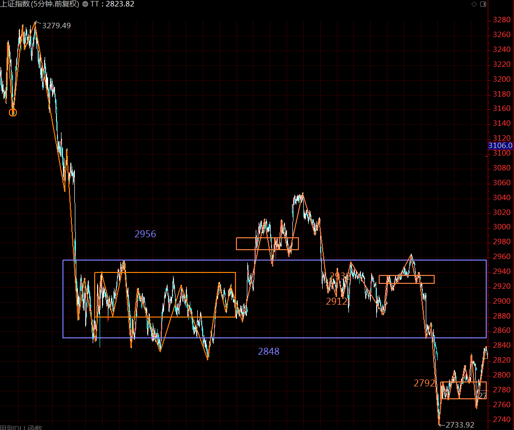 上周市場整體都處在構(gòu)建第三類賣點的階段,周五的高點2840目前初步確認(rèn)為第三類賣點的精確位置,如果就此轉(zhuǎn)下,下一步2792點就顯得尤為重要,如果往下的五分鐘線段未能跌破2792點,那這個位置是一個合理的建倉點,等同于針對下方三十分鐘中樞(九段擴張)的第三類買點。