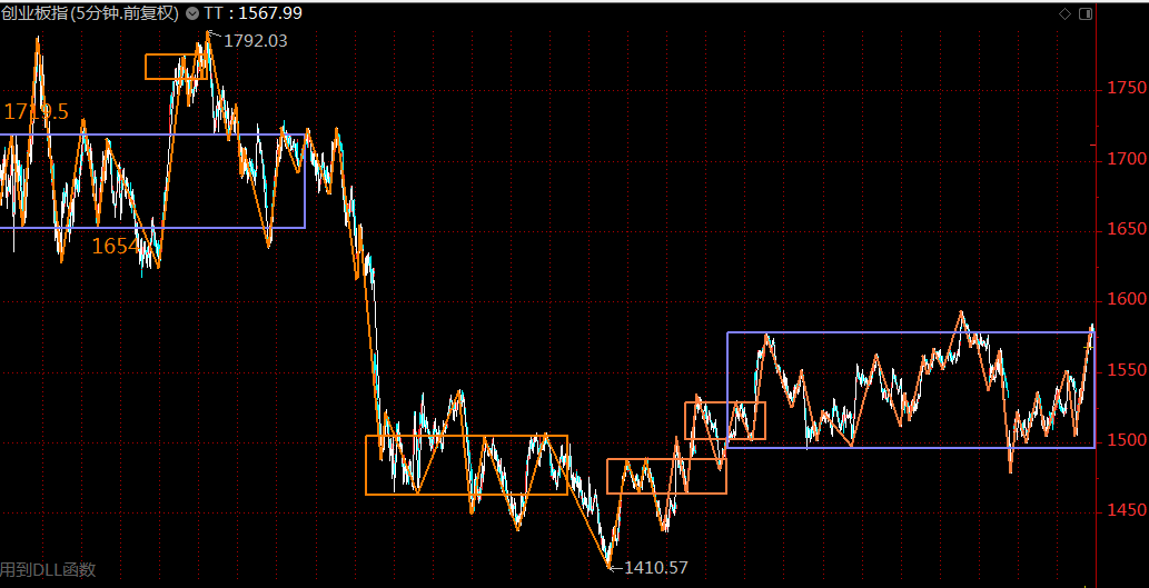 創(chuàng)業(yè)板這里走的比主板強勢很多,周四的陽線直接修復(fù)了形態(tài),目前在三十分鐘中樞內(nèi)部運行,中樞上軌1577點,周五已經(jīng)頂?shù)搅酥袠猩宪墸绻轮苣芡黄拼酥袠?,等五分鐘回落線段后構(gòu)建三買,可大膽介入做多。