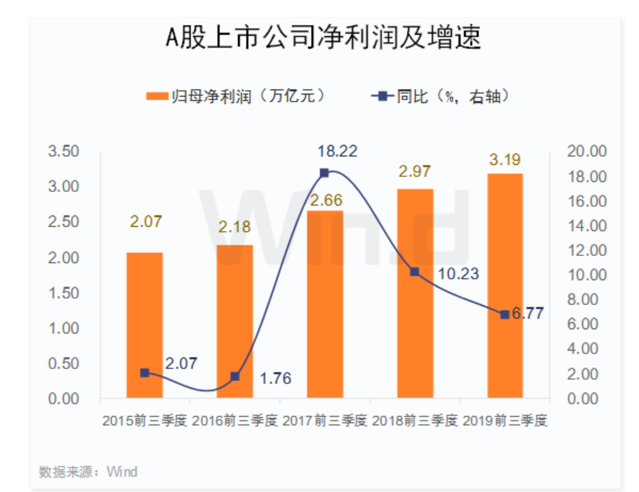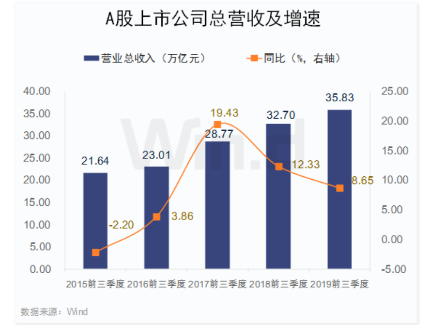 2019年前三季度A股上市公司合計實(shí)現(xiàn)營業(yè)總收入35.83萬億元,同比增長8.65%;實(shí)現(xiàn)凈利潤(備注:以下統(tǒng)計均為歸屬母公司凈利潤)3.19萬億元,同比增長6.77%。