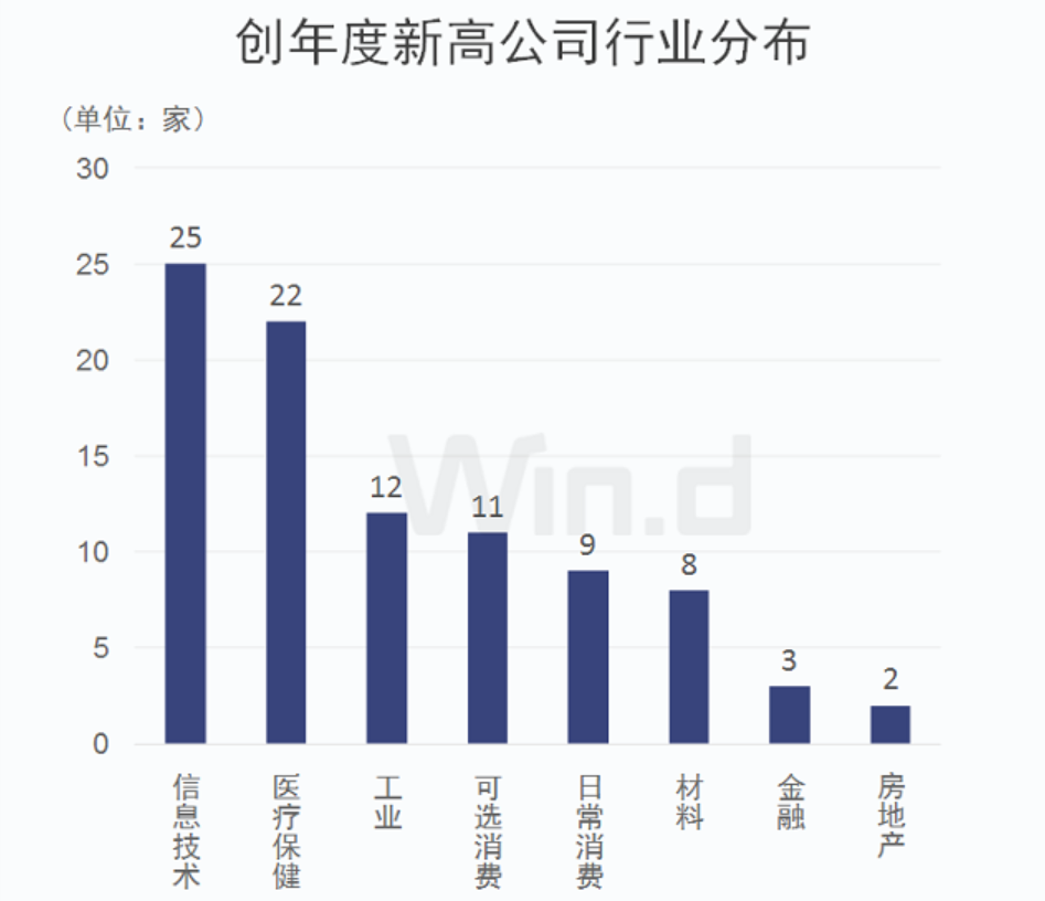Wind統(tǒng)計(jì)顯示,有92家公司近3日最高股價(jià)創(chuàng)今年以來新高。從相關(guān)公司行業(yè)分布來看,信息技術(shù)類最多,有25家;醫(yī)療保健行業(yè)緊隨其后,有22家,工業(yè)、可選消費(fèi)均有超過10家公司。可見,科技和生物醫(yī)藥類公司成為牛股聚集地。