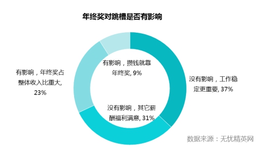但是即便大部分人對今年的年終獎的增長沒有信心,卻很難讓他們因為年終獎而跳槽。半數(shù)以上的受訪者年終獎?wù)既晔杖氲谋壤齼H為20%左右,即便不滿意年終獎,但工作的穩(wěn)定性、工作環(huán)境、企業(yè)福利是他們更看重的要素。有3成受訪者表示收入依賴年終獎,如果年終獎不滿意一定會尋找機(jī)會跳槽。因此企業(yè)在人才管理上,需要特別注意年終獎對于員工保留的影響,提前做好預(yù)防工作。