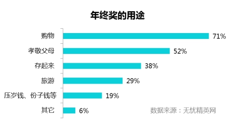 在年終獎的使用上,71%的人會用于購物,52%的人會用于孝敬父母,38%的人會將年終獎存一部分起來,29%的會用于旅行。超過一半的人,以上年終獎的使用類別超過了3項,人生的那點小夢想,全仰仗年終獎?!捌綍r每個月還完房貸,收入只夠生活,提升生活質(zhì)量,全靠年終獎,去年的年終獎,我給自己買了臺蘋果筆記本電腦;今年的年終獎,準(zhǔn)備用來去普吉島旅行,沒有年終獎肯定要哭死?!?剛在上海買了房的小杰告訴我們。