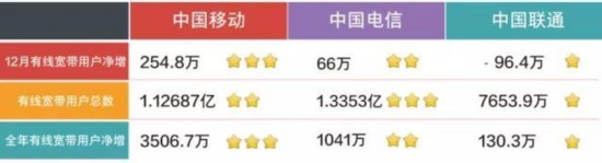 (各個(gè)項(xiàng)目中,第一為三顆星,第二為兩顆星,第三為一顆星。以上數(shù)據(jù)測(cè)算依據(jù)三大運(yùn)營(yíng)商公布的營(yíng)運(yùn)數(shù)據(jù)。)