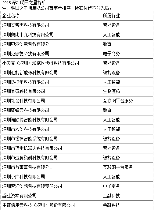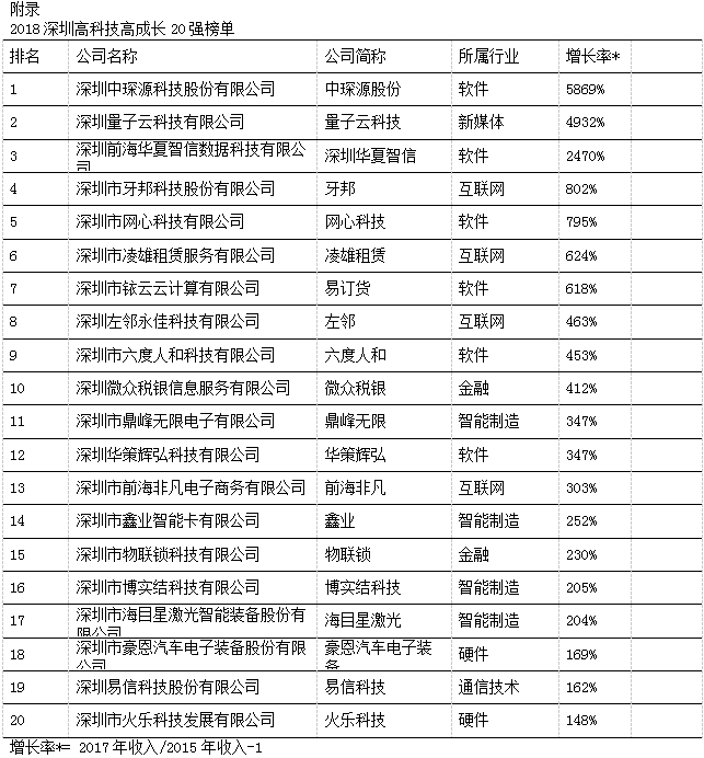 今年,榮登“深圳20強(qiáng)”三甲的獲獎(jiǎng)企業(yè)分別為深圳中琛源科技股份有限公司、深圳量子云科技有限公司和深圳前海華夏智信數(shù)據(jù)科技有限公司,他們?cè)谶^去三年中表現(xiàn)出的平均增長(zhǎng)率分別為5,869%、4,932%和2,470%。本年度入選“深圳20強(qiáng)”的企業(yè)除了軟件、硬件、互聯(lián)網(wǎng)和通訊技術(shù)外,也不乏其他新興領(lǐng)域,如新媒體、智能制造和金融科技。此外,為表彰深圳市當(dāng)?shù)乇憩F(xiàn)優(yōu)秀且極具潛力的初創(chuàng)企業(yè),今年共有20家企業(yè)獲選“深圳明日之星”,它們來(lái)自多個(gè)不同的領(lǐng)域,包括人工智能、智能設(shè)備、電子商務(wù)、教育、生物醫(yī)藥、金融科技和互聯(lián)網(wǎng)平臺(tái)服務(wù)等 (詳見附錄)。獲選成為“深圳20強(qiáng)”和“深圳明日之星”的企業(yè),將自動(dòng)成為“中國(guó)高科技高成長(zhǎng)50強(qiáng)”(簡(jiǎn)稱“中國(guó)50強(qiáng)”)和“中國(guó)明日之星”的候選企業(yè),并在今年11月與全國(guó)其他入圍企業(yè)角逐,躋身全國(guó)增長(zhǎng)最快、最具發(fā)展?jié)摿Φ母呖萍计髽I(yè)之列。