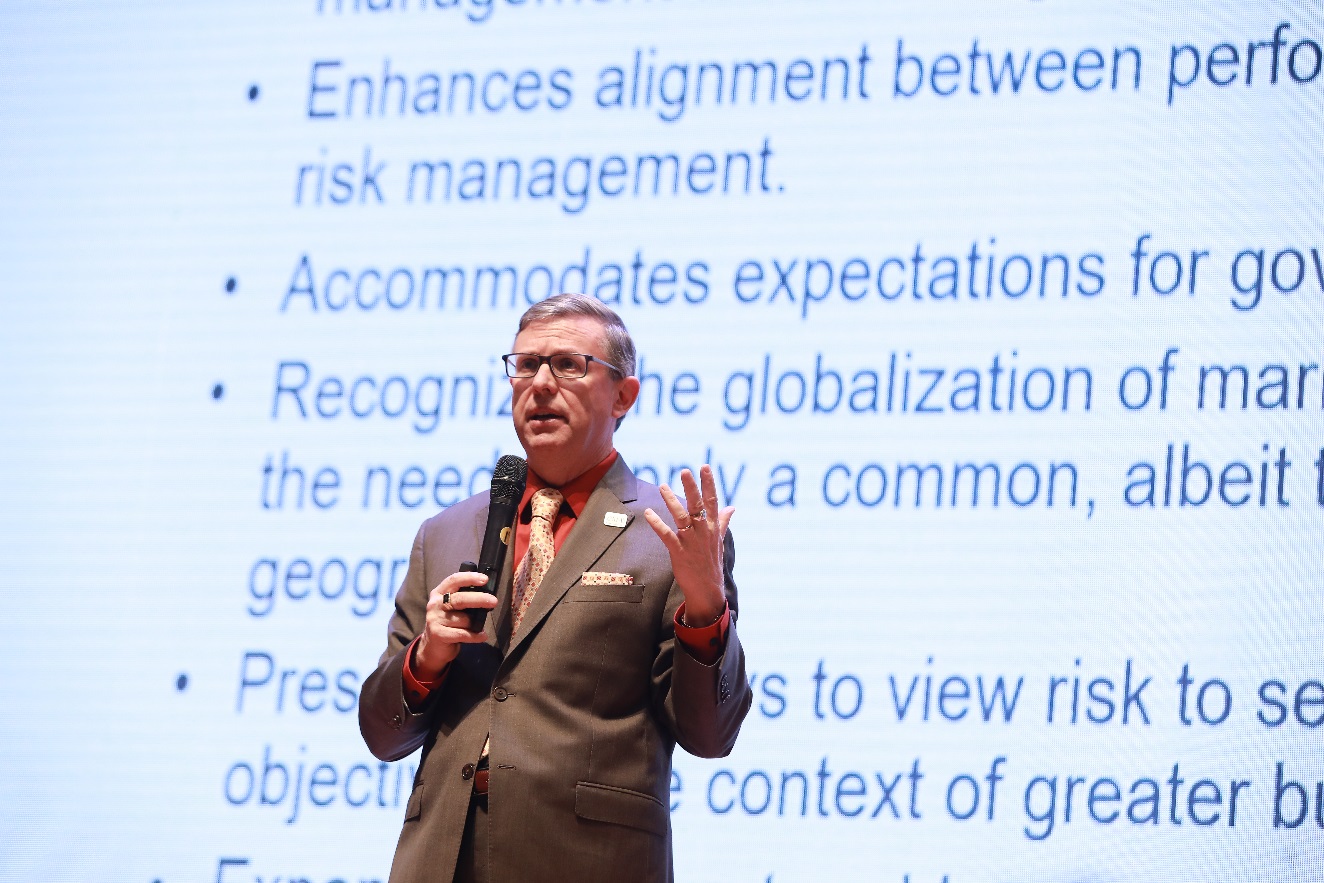 IMA總裁兼首席執(zhí)行官 Jeffrey Thomson以“企業(yè)風(fēng)險管理——風(fēng)險與戰(zhàn)略和績效協(xié)調(diào)一致”為主題,圍繞美國反虛假財務(wù)報告委員會下屬的發(fā)起人委員會C OSO的企業(yè)風(fēng)險管理最新框架,與現(xiàn)場嘉賓分享了企業(yè)風(fēng)險管理所需要注意的問題。Thomson表示,風(fēng)險管理并非單一孤立,而應(yīng)當(dāng)貫穿于戰(zhàn)略制定、績效考核、內(nèi)部控制等企業(yè)管理的方方面面。他強調(diào),風(fēng)險管理并非是“杜絕”風(fēng)險,而更重要的是確定風(fēng)險偏好,管控風(fēng)險的同時分析發(fā)現(xiàn)企業(yè)發(fā)展的機遇。