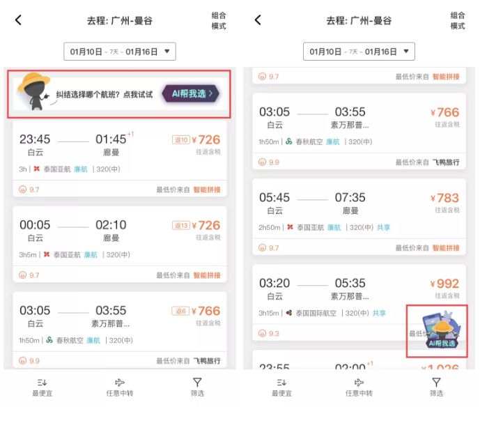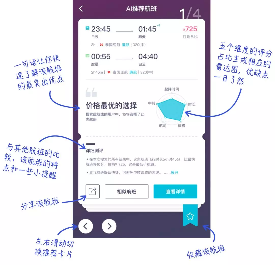 iGola通過AI技術(shù)將傳統(tǒng)的機(jī)票搜索頁面中,數(shù)十條的結(jié)果優(yōu)選為5條,通過測(cè)試,5條搜索結(jié)果可以基本cover用戶95%的選擇可能。將價(jià)格時(shí)長(zhǎng)航司中轉(zhuǎn)起降時(shí)間,設(shè)置為5個(gè)維度,以五星維度圖的形式對(duì)相關(guān)航旅方案進(jìn)行直觀的評(píng)價(jià),并給出明顯的文字提示,闡明航旅方案亮點(diǎn)。定制內(nèi)容-千人千面,不同需求的乘客(重視價(jià)格、重視服務(wù)),會(huì)得到不同的搜索結(jié)果。UI設(shè)計(jì)與傳統(tǒng)的OTA搜索界面有巨大差異,操作極簡(jiǎn),深受年輕用戶喜歡。