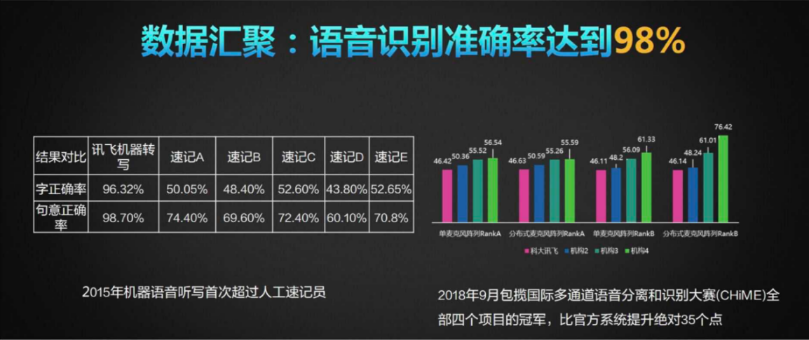 在英文語音識別、機器閱讀理解、國際識別挑戰(zhàn)賽等多個A.I.領域的國際賽事 中,科大訊飛均名列前茅, 至今已獲得12項世界第一。2018年9月,訊飛再次包攬國際多通道語音分離和識別大賽(CHiME-5)全部四個項目的冠軍,該大賽被稱為“史上最難語音識別任務”,考察的是在不同場景中自由交談的遠場語音識別效果。也再次證實了訊飛語音識別在噪音、口音和遠場識別挑戰(zhàn)下的絕對領先優(yōu)勢。與此同時,訊飛轉寫引擎于2005年開始應用服務,期間歷經數(shù)次迭代升級。