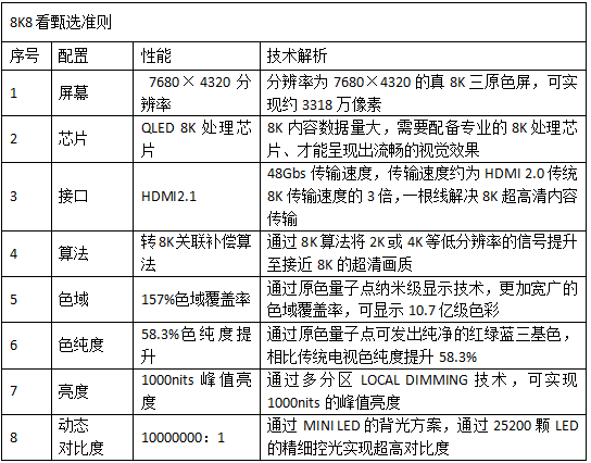 在行業(yè)趨勢(shì)及國家政策的雙重推動(dòng)下,為正確引導(dǎo)8K電視市場發(fā)展方向、加快發(fā)展步伐,TCL聯(lián)合國家廣播電視產(chǎn)品質(zhì)量監(jiān)督檢驗(yàn)中心經(jīng)過長時(shí)間的市場調(diào)研及總結(jié),從行業(yè)整體的角度對(duì)8K電視進(jìn)行了初步探討,并編制出《8K8看甄選白皮書》。這份白皮書告訴我們,實(shí)現(xiàn)真正的8K震撼視覺體驗(yàn)關(guān)鍵性能/技術(shù)要求如下。