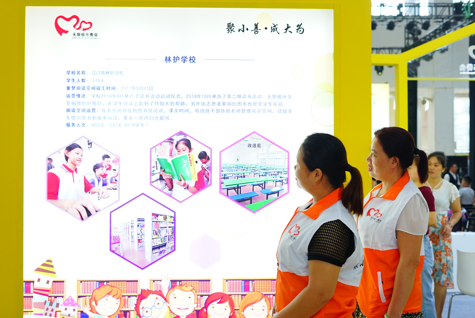 在南國書香節(jié)江門分會場的場館中央,“黃色小屋”尤其吸人眼球。在項目展示上,無限極樂善會多年來一直關(guān)注鄉(xiāng)村兒童的閱讀教育問題,自2015年起,攜手江門市相關(guān)政府部門發(fā)起了童夢閱讀空間公益項目,致力于兒童閱讀空間建設及校內(nèi)閱讀推廣工作。在展區(qū),可以看到五所童夢閱讀空間的運營等基本情況。