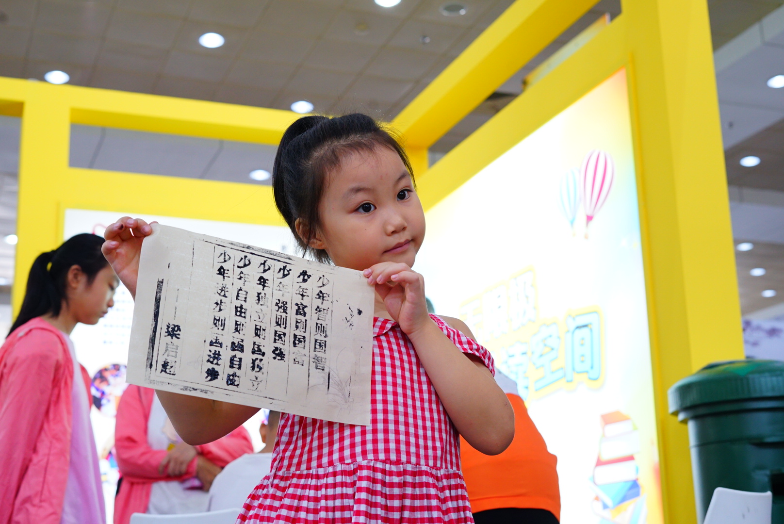 有了一系列視覺沖擊,現(xiàn)場還鼓勵大家動動手,“活字印刷”區(qū)和“手工布書”體驗區(qū)也是不容錯過。體驗涂墨、拓壓等工序,活字印刷術(shù)聽就聽得多了,小朋友見還是第一次見,還有機會親自體驗一番,感受濃濃書香氛圍。印刷的內(nèi)容節(jié)選自江門籍思想家、教育家梁啟超的愛國散文《少年中國說》。
