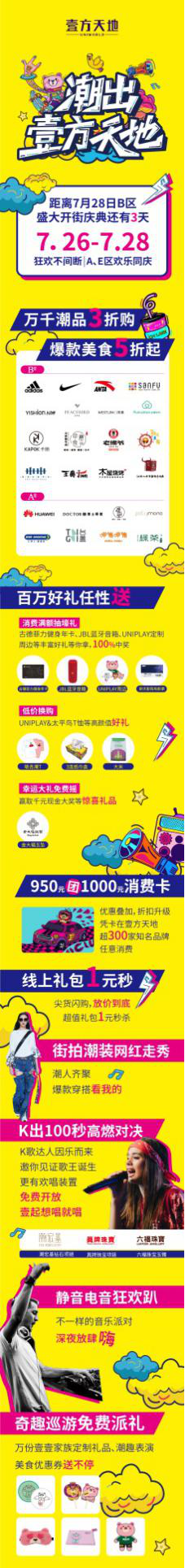 開業(yè)期間,精彩紛呈的活動當然是必不可少的。7.26-7.28開業(yè)期間,B區(qū)將聯(lián)動A區(qū)、E區(qū)開展一系列活動。開業(yè)活動緊扣B區(qū)定位“潮流品味先鋒主場”,充分抓住當下年輕人愛玩、敢玩的特色,將整個壹方天地變?yōu)槌比ぁ㈧趴岬臍g樂海洋。