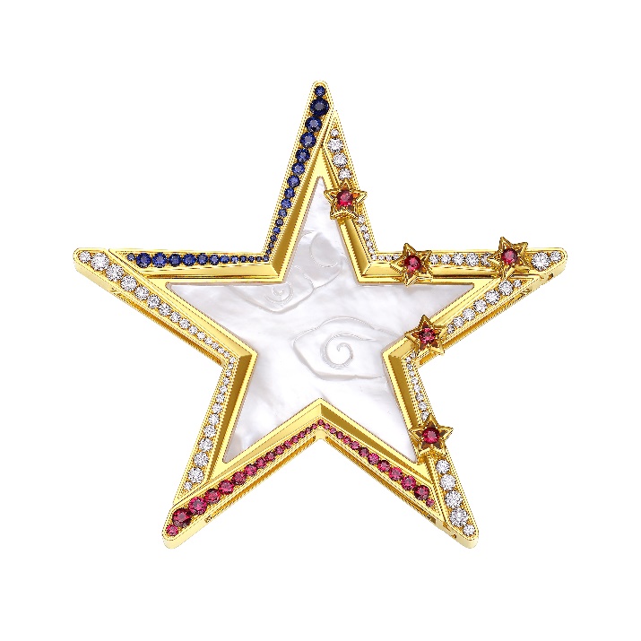 作為本次發(fā)布會主角,周大福17916系列新品“宸”曾作為第11屆“法國圣埃蒂安國際設(shè)計雙年展”參展作品,在世界舞臺上綻放過光芒。“五角星”的造型融入了法國國旗藍、白、紅三色和中國國旗的五角星元素,代表了中法兩國的交流與合作,雙方希望通過宸這樣意義深遠的產(chǎn)品,見證和促進兩國的和平發(fā)展與經(jīng)濟交流?!板贰币员睒O星為靈感來源,寓意點亮年輕人的生活與夢想。別具一格的五角星設(shè)計藝術(shù)感十足,鉆石與22K金的加持,更讓整個作品展現(xiàn)出奪目光彩。白貝母項鏈外圈圍以鉆石、寶石,一款三戴,幻化無限魅力。簡潔的五角星造型,干凈有力,猶如夜空中指引前行的明星。