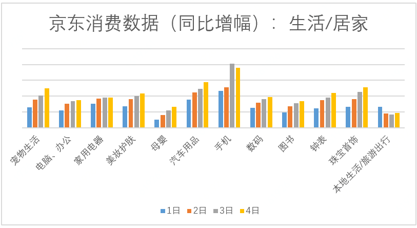 外出旅游如火如荼,“宅”在家中的朋友也不甘寂寞,趁著長(zhǎng)假期間在京東平臺(tái)上為自己、家人或朋友挑選稱心的商品無疑是最佳的選擇。寵物生活、電腦、母嬰、美妝護(hù)膚、汽車用品、手機(jī)數(shù)碼等商品的銷量在1-4日內(nèi)持續(xù)增長(zhǎng),其中受“京東超級(jí)品牌日”等因素影響,手機(jī)類商品的銷售增長(zhǎng)在3日達(dá)到峰值;有意思的是,一些看似與節(jié)日無關(guān)的消費(fèi)如圖書、鐘表等相比去年也有較大的漲幅,體現(xiàn)了消費(fèi)者的多元化需求;而國(guó)慶期間的“結(jié)婚潮”則拉高了珠寶首飾的相關(guān)銷售。