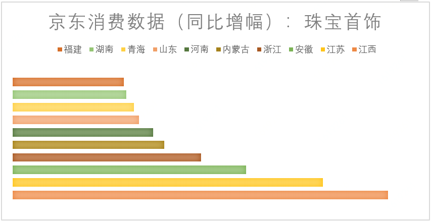 而在珠寶首飾的需求上,東南省份再次成為消費(fèi)主力軍,其中江西省的同比增幅達(dá)到300%以上,看來在江西的小伙伴今年國(guó)慶期間可沒少參加婚禮。