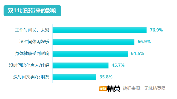 雙11高強度的加班,導致職場精英們的生活受到較大影響,76.9 %的人因為工作時間過長,覺得太累;66.9 %的人因為加班沒有時間休閑娛樂;61.5 %的人身體健康帶來影響;45.7 %的人沒時間陪伴家人/伴侶;更有35.8 %的人,將沒有男朋友/女朋友的鍋,扣到了雙11的頭上。