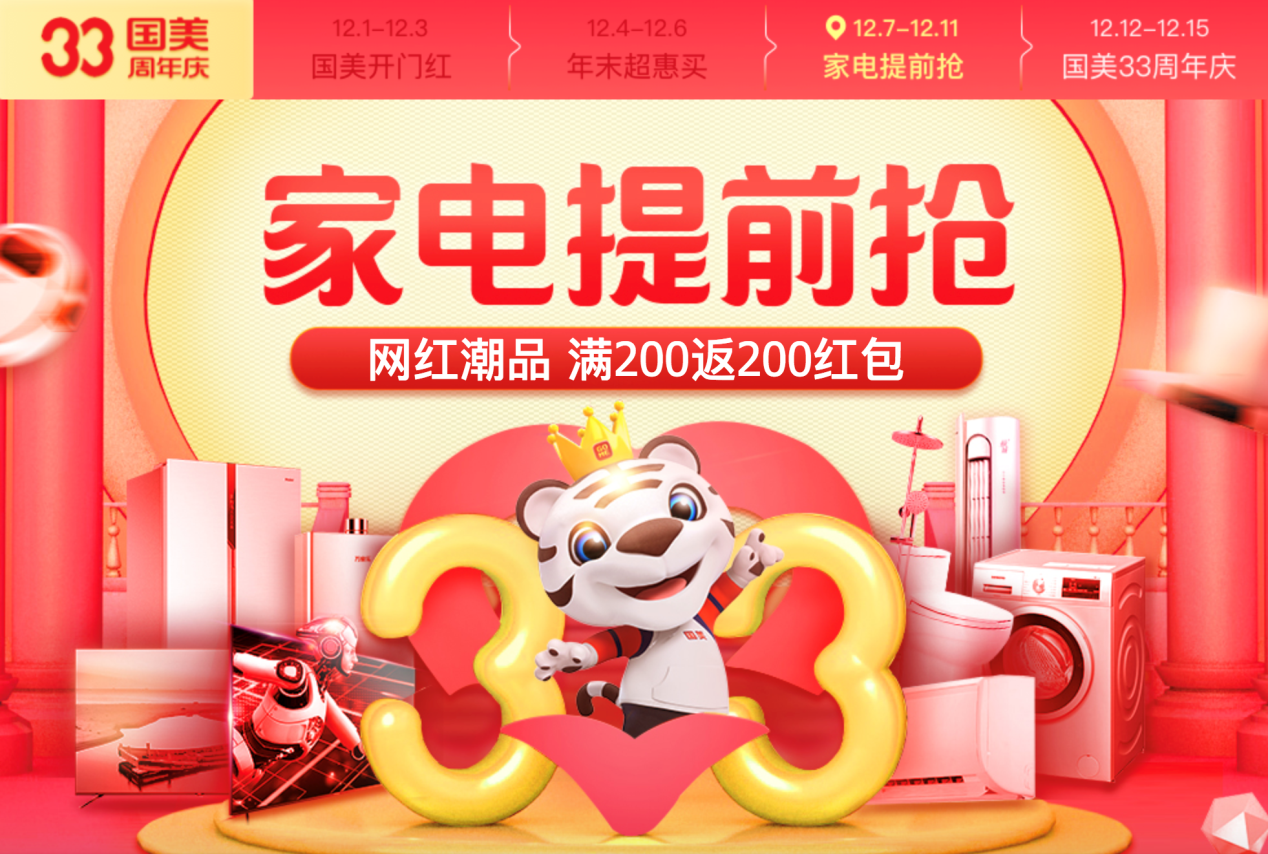 12月12日-14日,國(guó)美33周年“超級(jí)夜市”,線(xiàn)上商城、線(xiàn)下門(mén)店共赴一場(chǎng)“巔峰2小時(shí)”的盛宴。家裝、換新、添置新物件,所有的需求在國(guó)美一次滿(mǎn)足。