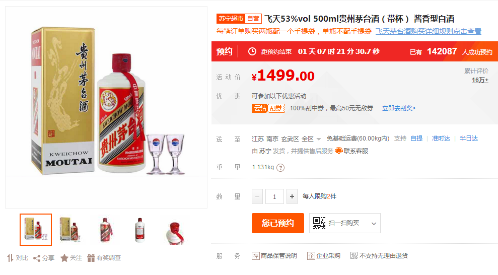 買年貨上蘇寧,買好酒上蘇寧。要說年貨節(jié)期間,蘇寧超市酒水類目的明星產(chǎn)品,還要屬1499元的飛天茅臺酒。年貨節(jié)期間,蘇寧已經(jīng)啟動了多輪的飛天茅臺酒的預(yù)約搶購,而1月10日即將迎來新一輪的搶購。截至1月8日上午10點(diǎn)多,已經(jīng)有超過14萬實名認(rèn)證super會員參與了本次預(yù)約。