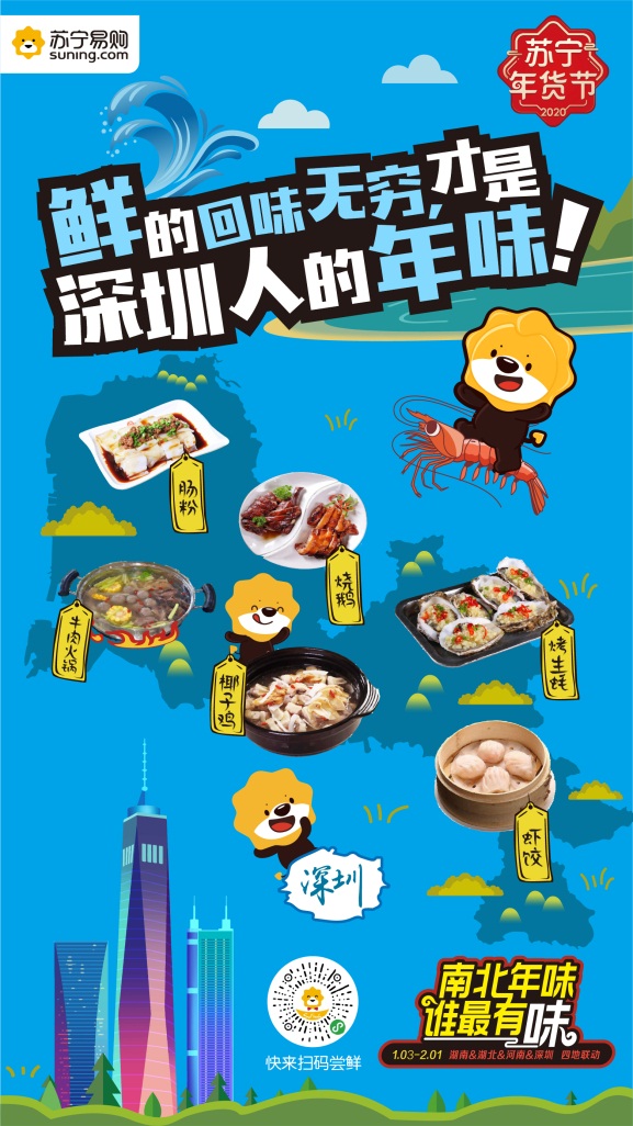 說起年味必提到年夜飯,中國地大物博每個城市的年夜飯各有特色,究竟哪個城市的年味最濃,各家眾說紛紜。為此華南、華中、華北具有代表性的四個城市紛紛站出來為各家城市的年味代言,深圳、武漢、長沙、鄭州四城分別從年味、年俗、年貨、方言等方方面面為消費者獻上了一頓年味大餐。那些記憶里存在的各色過年儀式,味覺里保留的故鄉(xiāng)味道,腦海里熟悉的地方鄉(xiāng)音,在這場年味比拼里一一重現(xiàn),喚醒了大家對于過年的期許,引發(fā)社交平臺上大家對于年味的分享。對于深圳這個移民大城往往被貼上沒有特色年貨的標簽,其實不然,作為嶺南文化重要傳承地的深圳擁有眾多特色年俗。并且隨著越來越多的人選擇春節(jié)留在深圳過年,深圳的年味也越來越濃,因此深圳蘇寧在本次南北年味的話題中,不斷深挖深圳年味,打造了一張?zhí)厣某鞘写汗?jié)名片。