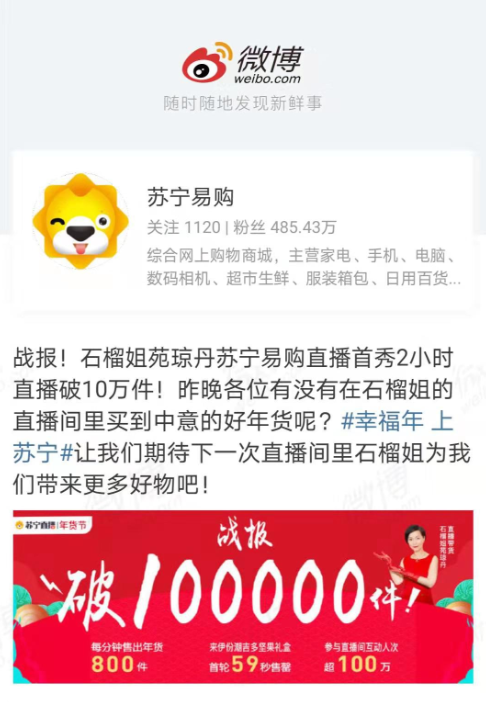 2020年伊始,“風(fēng)華絕代”的石榴姐苑瓊丹在蘇寧易購開始了新年帶貨直播首秀,為全網(wǎng)用戶推薦實用年貨,超過100萬人“圍觀”了直播,兩小時帶貨超10萬件,平均每分鐘售出800件年貨,其中最受消費者歡迎的來伊份潮吉多堅果禮盒59秒售罄,創(chuàng)下2020年明星帶貨的新記錄!