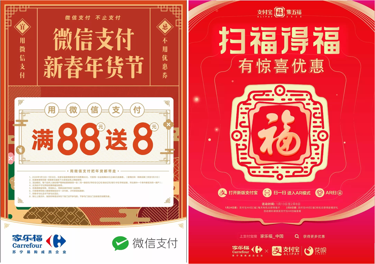 除此之外,各大支付平臺優(yōu)惠券亦開始發(fā)放,助力您的年貨采買。前方高能預(yù)警!1月13日至2月8日,顧客使用支付寶掃上圖“?!弊忠约皡⑴c集五福活動,即有機(jī)會獲得家樂福全場滿200減10優(yōu)惠券。1月13日至1月30日,在家樂福使用微信支付消費(fèi)滿80元,可獲得一張全場滿88元立減8元優(yōu)惠券,