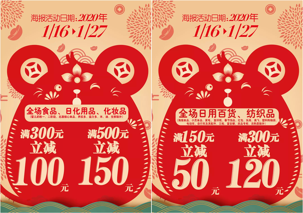 1月16日至1月27日,家樂福華南區(qū)全場食品、日化用品、化妝品滿300元立減100元,滿500元立減150元;全場日用百貨、紡織品(除家電)滿150元立減50元。細(xì)則請見家樂福店內(nèi)信息板或洽詢工作人員。