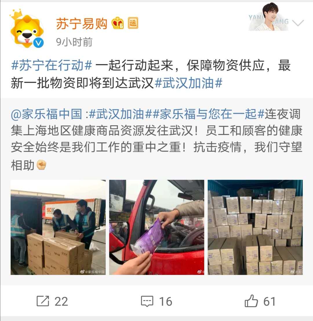在疫情后方,不少后勤保障單位、組織也是做好了充足的準(zhǔn)備。1月23日,蘇寧旗下家樂福中國官方微博發(fā)布了一條關(guān)于 #家樂福堅決不漲價,虧錢也不能漲!#的微博表示,家樂福中國管理團(tuán)隊承諾春節(jié)期間民生用品不漲價,同時針對武漢及全國范圍都提前備好充足貨量,誓與全國人民一起共渡難關(guān)。