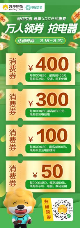據(jù)了解,深圳蘇寧3月16日至3月31日期間放出大招,強(qiáng)勢(shì)推出“萬(wàn)人領(lǐng)券搶電器”活動(dòng),攜手空調(diào)、廚衛(wèi)、冰洗、彩電、3C數(shù)碼和生活電器全品類百大品牌全面發(fā)力,以千萬(wàn)補(bǔ)貼讓利回饋消費(fèi)者。針對(duì)整個(gè)粵東區(qū)域限量投放近20萬(wàn)張400元、300元、100元、50元不等的家電消費(fèi)券,在活動(dòng)前期通過(guò)社群、門(mén)店、金牌V購(gòu)等線上線下即可領(lǐng)取,在粵東區(qū)域所有蘇寧門(mén)店及V購(gòu)均可使用。