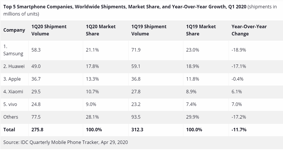 見圳客戶端·深圳新聞網(wǎng)2020年5月6日訊 國(guó)際權(quán)威機(jī)構(gòu)IDC最新報(bào)告顯示,全球智能手機(jī)出貨量在2020年第一季度同比下降11.7%。其中,三星、華為、蘋果依舊穩(wěn)居前三,分別為21.1%、17.8%和13.3%。
