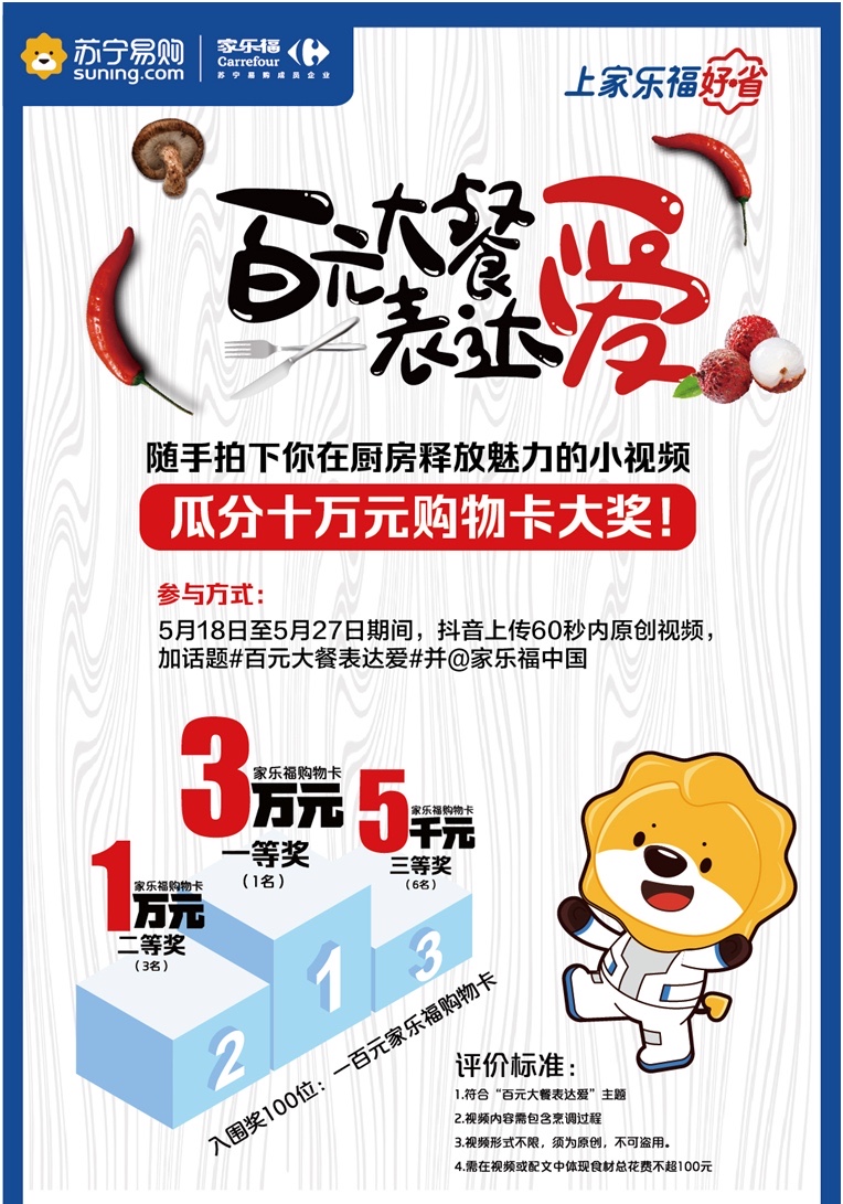 近期陳老伯和女兒聊的最多的除了做菜,還有父女倆都很期待的一場比賽。據(jù)悉,5月18日至6月18日,家樂福將舉辦一場主題為“百元大餐表達愛”的鄰家大廚視頻PK賽,鼓勵參賽者做道有故事的菜,向摯愛的人表達濃濃的情意。你負責做菜,家樂福負責買單。你無需具備可媲美專業(yè)廚師的高超技藝,僅需擁有一顆熱愛美食的心和一雙巧手,無論是國人經(jīng)典標配的“四菜一湯”,抑或是最適合情侶的西式浪漫—牛扒配紅酒,隨你發(fā)揮。以百元預算準備食材,將烹調(diào)過程上傳抖音。屆時,突圍選手將有機會瓜分價值十萬元的購物卡大獎。
