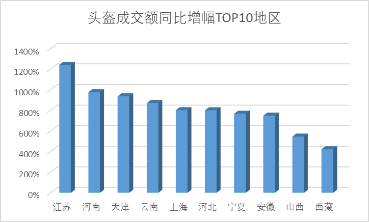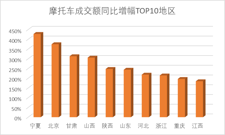 頭盔取得高速增長(zhǎng)的同時(shí),摩托車、電動(dòng)車的成交額增幅也分別超過110%和50%。寧夏、北京、甘肅、陜西等地區(qū)摩托車成交額同比增幅較高,而西藏、北京、寧夏、甘肅等地區(qū)的電動(dòng)車成交額同比增幅較高。