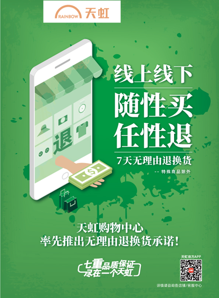 今年4月,為了營造溫暖舒心的消費(fèi)環(huán)境,深圳市消費(fèi)者委員會(huì)發(fā)起“線下無理由退貨承諾”,鼓勵(lì)深圳線下實(shí)體店參與,改善居民消費(fèi)體驗(yàn),增強(qiáng)居民消費(fèi)信心。天虹積極響應(yīng)號召,作為深圳首批“線下無理由退貨”的實(shí)體店參與并向廣大消費(fèi)者作出服服承諾,也將“承諾”推廣至全國。值得一提的是,為了讓購物中心的消費(fèi)者能共享,天虹首次嘗試在購物中心業(yè)態(tài)也深耕這項(xiàng)服務(wù),竭力滿足顧客需求。