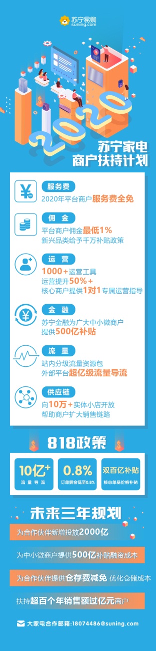 蘇寧宣布,2020年蘇寧將免收平臺(tái)商戶服務(wù)費(fèi);向中小微商戶提供500億補(bǔ)貼融資成本,幫助商戶緩解資金壓力;平臺(tái)上的商品供應(yīng)鏈會(huì)向蘇寧生態(tài)中10萬(wàn)+實(shí)體小店開放,幫助商戶擴(kuò)大銷售通路。同時(shí),大家電行業(yè)線將持續(xù)給平臺(tái)商戶匹配站內(nèi)外的億級(jí)流量,并通過(guò)星河生態(tài)賦能平臺(tái)開放1000+運(yùn)營(yíng)工具,針對(duì)核心商戶提供1對(duì)1專屬運(yùn)營(yíng)指導(dǎo),借此幫助商戶有效提升經(jīng)營(yíng)效率,降低運(yùn)營(yíng)成本。