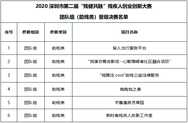 2020深圳市第二屆“殘健共融”殘疾人創(chuàng)業(yè)創(chuàng)新大賽團隊組(自強類)晉級決賽名單
